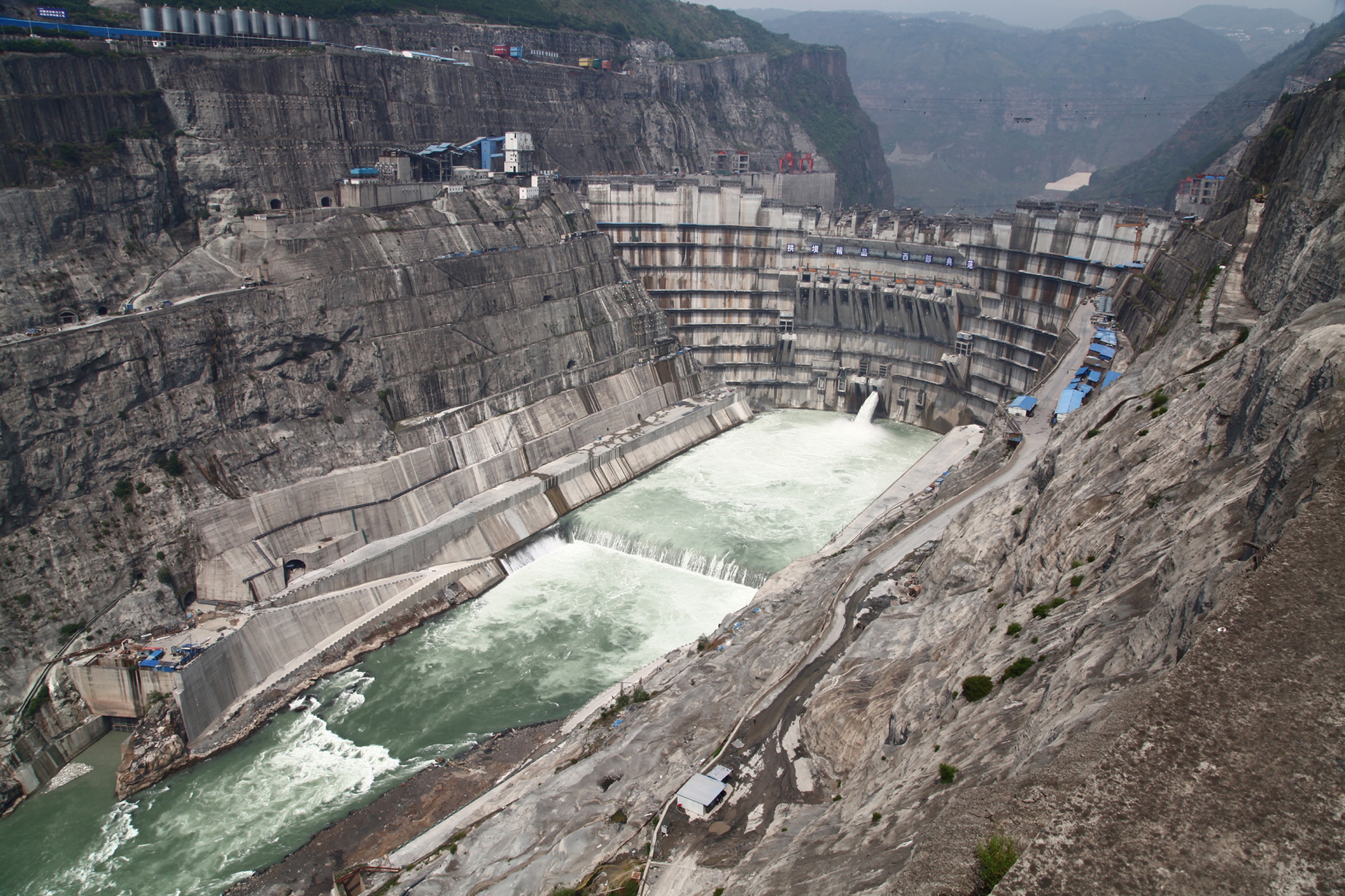三峡大坝为混凝土重力坝,坝顶高程185m,最大坝高181m,坝底宽度126m,坝轴线全长2309.50m,共分为113个坝段。大坝自左向右分为:左岸非溢流坝段、升船机坝段、临时船闸坝段、左岸厂房坝段、左导墙坝段、泄洪坝段、纵向围堰坝段、右岸厂房排沙孔坝段、右岸厂房坝段、右岸非溢流坝段。坝段间采用横缝分隔,各坝段可单独受力。泄洪坝段横缝间距21.00m;厂房坝段钢管坝段横缝间距25.00m、实体坝段横缝间距13.30m;两岸非溢流坝段横缝间距一般为20.00m。横缝上游侧设有两道止水铜片。