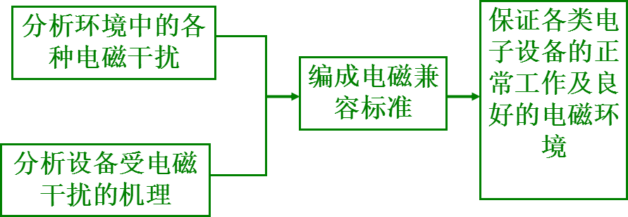 上述三个定义虽然措辞不同,但都可概括为两个方面:(1)设备或系统承受电磁骚扰时,能正常工作;(2)设备工作时,不产生超过规定值的电磁骚扰。